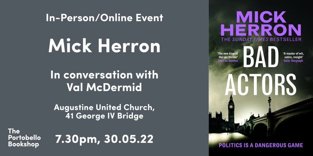 Mick Herron is coming to Edinburgh to discuss his latest Slough House thriller, Bad Actors. at Augustine United Church on George IV Bridge. This will be a night of criminally good conversation with fellow crime author, Val McDermid. The event is being hosted by The Portobello Bookshop.